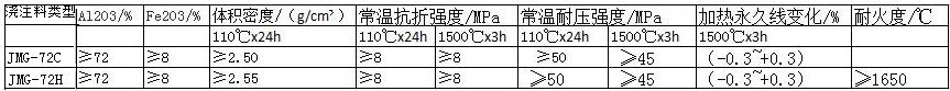 2.2 熱軋高溫加熱爐用鎂鉻質耐火澆注料標準 熱軋高溫加熱爐用鎂鉻質耐火澆注料牌號分為 JMG-72C 、JMG-72H。其中J為澆注料第1個字的漢語拼音首字母,M、G為鎂鉻的漢語拼音首字母:JMG后面的數字表示產品的MgO含量。數字后面字母H表示有特定要求的材質,C表示普通材質要求。熱軋高溫加熱爐用鎂鉻質耐火澆注料的性能應符合表7 表7軋鋼加熱爐用鎂鉻耐火澆注料性能指標