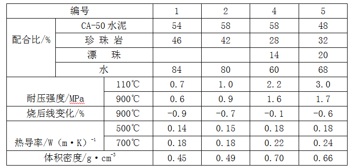 表1-1為珍珠巖澆注料的配合比和性能。從表中看出,隨著水泥用量的增加,體積密度越大,強度提高,熱導率降低,燒后線變化減小,由于水泥用量的增加,即珍珠巖用量的減少,因此用水量也隨之減少。
