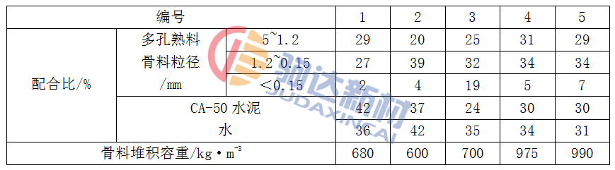 表1-1 澆注料的配合比和骨料容重