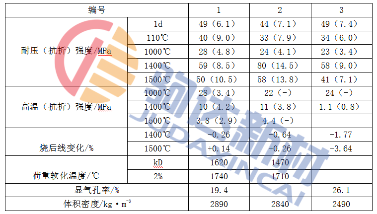 電熔鋁酸鹽水泥耐火澆注料配制時,水泥用量為18%,耐火粉料采用電熔剛玉粉,耐火骨料最大粒徑為5mm,其顆粒級配(%)為:5~3mm,30~40;3~1m;25~30mm;<1mm,35~45。同時用緩凝劑和減水劑等復合外加劑。該澆注料成型初凝后,因水化熱在8h內(nèi)放出較多,故應在潮濕環(huán)境中自然養(yǎng)護,或進行標養(yǎng),但不宜放進水中養(yǎng)護。養(yǎng)護到期后,檢驗常溫強度。烘干后,檢驗各種高溫性能,詳見表1-1。表中編號1、編號2和編號3,分別用電熔剛玉、燒結(jié)剛玉和一級礬土熟料作耐火骨料,其水用量分別為9%,8.7%和12%。從表中看出,1天常溫耐壓強度達到43~50MPa,顯示了快硬旱強的特點,其強度已占總強度的80%左右。