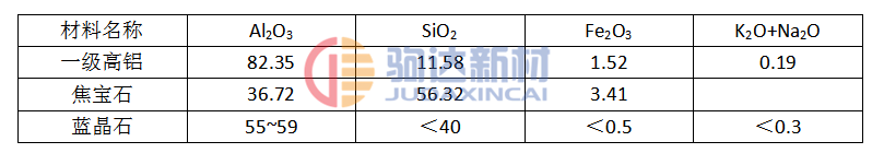 根據(jù)上述鍛造加熱爐爐門破損原因分析,鄭州駒達新材料認為通過合理選擇澆注料的原材料,組分配比的調(diào)整和外加劑方面的研究,可以改善爐門澆注料的使用性能,達到提高爐門使用壽命的目的。為此,在爐門澆注料的原材料選擇方面進行了相應(yīng)的研究與分析。選取了耐火度、抗熱震性及高溫抗沖刷性能優(yōu)良的特級焦寶石和一級高鋁熟料作為澆注料的骨料,以改善澆注料的高溫性能。從改善澆注料的常溫與高溫結(jié)合強度、體積穩(wěn)定性等方面考慮,選取一級高鋁粉為澆注料的主要粉料,水泥及微粉為復合結(jié)合劑,藍晶石為膨脹添加劑,水泥及微粉為復合結(jié)合劑,藍晶石為膨脹添加劑。從改善澆注料的常溫與高溫結(jié)合強度、體積穩(wěn)定性等方面考慮,選取一級高鋁粉為澆注料的主要粉料,水泥及微粉為復合結(jié)合劑,藍晶石為膨脹添加劑。從改善澆注料抗熱震性、防暴性和降低密度方面考慮,選取了力學性能與抗高溫粉化性能優(yōu)良的無機高鋁纖維為防爆、增強添加劑。此外,為了滿足鍛造加熱爐爐門澆注料的施工性能和其他相關(guān)的使用性能,選擇了多種有機與無機減水劑、分散劑為復合外加劑。澆注料主要原材料的理化性能如表1所示。