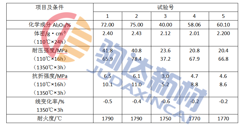 根據(jù)上述的原材料選擇原則與澆注料性能改進思路,按照澆注料中Al2O3的含量不同進行了多個配方設(shè)計,并在實驗室進行了配方調(diào)整實驗機抗熱震性實驗。按照實驗預定的高抗熱震性技術(shù)要求,確定了5個性能優(yōu)良的澆注料配方,分別制成40mm×40mm×160mm的試樣進行詳細的理化性能檢測,具體檢測結(jié)果如表2。