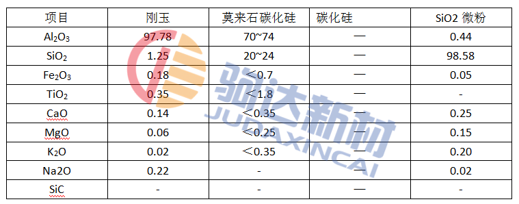 試驗所用的合成莫來石、剛玉、氧化硅微粉和碳化硅的化學組成列于表1。