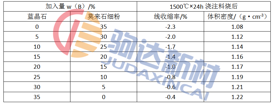 將煅燒好的輕質(zhì)莫來石骨料毛坯破碎成≤1cm的顆粒,并將其分為3mm~10mm,0.5mm~3mm及<部分分別作為隔熱耐火澆注料的粗骨料和細骨料。為了控制澆注料最終產(chǎn)品的體積密度,可用部分0.5mm~2.85mm鋸末或膨脹珍珠巖代替細骨料。小于0.5mm部分輕質(zhì)莫來石粉料用振動磨磨細至≤43um,部分作為澆注料的細分部分生產(chǎn)澆注料,部分作為高純莫來石細粉出售。為了減少澆注料在高溫使用過程中的線收縮,需加入部分藍晶石作為膨脹劑。藍晶石以≤74um細粉形式加入。為了進一步提高莫來石隔熱耐火澆注料的耐高溫性能,在保證澆注料有足夠強度的同時,采用Al2O3含量在w(Al2O3)>80%的純鋁酸鈣水泥,這樣與采用普通高鋁水泥相比可使體系內(nèi)CaO的含量降低三分之一。為了促進澆注料的燒結(jié),拓寬燒結(jié)溫度范圍還需加入少量SiO2和Al2O3微粉。其中Al2O3微粉的加入量除了要使所加入的SiO2微粉全部轉(zhuǎn)化為莫來石外,還需要足夠的富余量與藍晶石受熱時分解出的SiO2發(fā)生反應形成莫來石。為了減少澆注料的干燥收縮和增加干燥后強度,還需加入少量的高效減水劑。由于莫來石隔熱澆注料的級配必須遵循顆粒最緊密堆積原理,因此藍晶石及SiO2微粉和Al2O3微粉的加入,勢必要減少莫來石細粉的加入量。為了確定藍晶石的適宜加入量,我們進行了系列試驗,結(jié)果見表3。