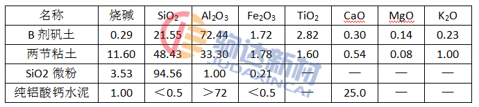 為了提高材料的抗震穩(wěn)定性,并考慮到加熱爐的最高使用溫度較高(超過(guò)1100℃),選用了B級(jí)礬土熟料作為主要原料,為了提高澆注料的結(jié)核性、干燥性和燒結(jié)性,引入了少量的粘土;為確保CaO的含量小于1.5%。選用純鋁酸鈣水泥作結(jié)合劑;為了提高澆注料的流動(dòng)性,配料中添加了SiO2微粉,因其較大的表面積及表面能,還有利于增強(qiáng)凝聚作用,從而提高預(yù)制塊的強(qiáng)度。各原料的化學(xué)成分列于表1。
