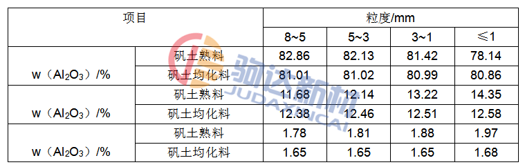 通過比較兩種礬土原料的物理化學(xué)性能可見,經(jīng)過均化提純處理的礬土均化料,無論其塊料還是各粒級的顆粒,均較飯團(tuán)糊料表現(xiàn)出良好的均一穩(wěn)定性。
