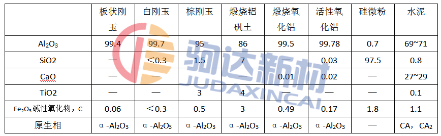 混合料由板狀剛玉、白剛玉、棕剛玉、煅燒鋁礬土、煅燒氧化鋁、活性氧化鋁、硅微粉和高鋁水泥組成。原料的基本化學(xué)組成列于表1,并用熒光衍射儀分析其巖相組成。