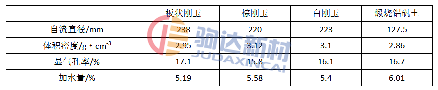表2示出了用不同氧化鋁作原料時(shí)制備的樣塊的性能。n為0.23的澆注料用板狀剛玉作原料時(shí),自流性能似乎最理想。也可以說,白剛玉和棕剛玉可作為生產(chǎn)自流澆注料的替代原料。然而澆注料用煆燒鋁礬土?xí)r,要獲得好的流動性能,振動是很必要的。