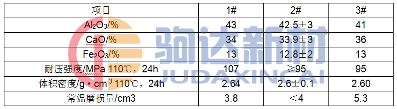 以合成料為骨料和基質料,加入的超微粉和C%的高鋁水泥結合劑而制成的高強耐磨澆注料的理化指標(1#),客戶的訂貨指標(2#)及國外某公司同類產品實物指標(3#)的對比見表3。