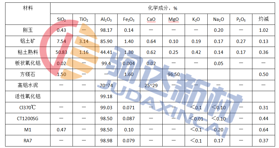 所采用的結合劑系統除了高鋁水泥外,還包括高反應能力的氧化物材料,以及無機的和有機的添加劑,它們都具有所要求的流變學性能。主要原材料的化學組成列于表1。