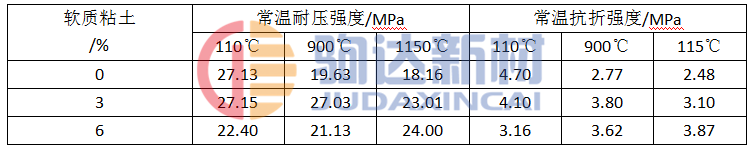 從表1可以看出,加入3%軟質(zhì)粘土對烘干強度影響不大,但加入6%軟質(zhì)粘土使烘干強度明顯下降。
