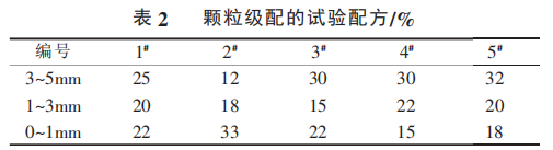 原料是以棕剛玉為骨料,碳化硅、水泥、uf-SiO2、α-Al2O3 為基質(zhì),試驗(yàn)用澆注料的骨料采用≤1mm、1 ~3mm、3~5mm 三級(jí)粒度。骨料和粉料的質(zhì)量比為 63~70∶37~30。澆注料的致密程度和流動(dòng)性跟顆粒級(jí)配密切相關(guān),而最佳的顆粒級(jí)配又隨骨料種類、臨界粒度的大小和基質(zhì)組成的不同而不同,最合適的顆粒級(jí)配應(yīng)該由試驗(yàn)確定。本試驗(yàn)選擇5種不同的顆粒級(jí)配,細(xì)粉部分全部相同,顆粒級(jí)配的試驗(yàn)配方如表2所示。這5個(gè)配方的試驗(yàn)結(jié)果示于圖1。