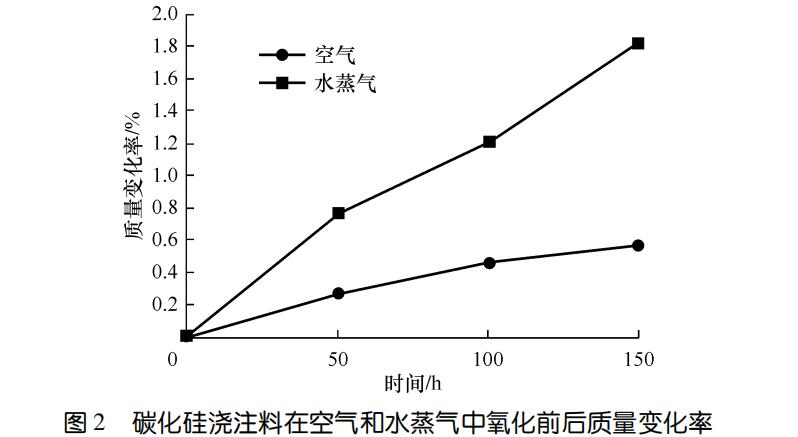 圖1示出了碳化硅澆注料在空氣和水蒸氣氧化前后的顯氣孔率。可以看出,無論是空氣還是水蒸氣氧化,顯氣孔率均變化不大。氧化150h試樣與氧化前相比,水蒸氣條件下的顯氣孔率略有增大;空氣條件下的顯氣孔率略有減小。可能與水蒸氣條件下試樣結構遭到較大破壞有關。一般情況下,碳化硅氧化會因氧化產(chǎn)物SiO2等堵塞氣孔導致氣孔率在氧化初期下降明顯,后期逐漸趨于平穩(wěn),但對于碳化硅澆注料卻沒有出現(xiàn)早期顯氣孔率下降的情況。可能