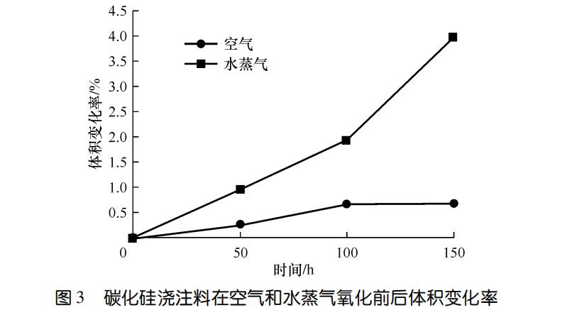 圖3示出了碳化硅澆注料在空氣和水蒸氣中氧化前后體積變化率。可以看出,空氣條件下體積變化率明顯小于水蒸氣條件下的。隨著時間的延長,空氣條件下的體積變化率趨于平緩和穩(wěn)定;在水蒸氣氧化后期,體積變化率異常增大,與試樣的結構遭到較大破壞引發(fā)顯氣孔率略有增加相吻合。高溫下水蒸氣向SiC磚孔隙中的滲透能力增加,同時由于高溫蒸發(fā)而造成的強制流動,改善了反應動力學條件,表觀活化能較小,氧化反應易于進行。
