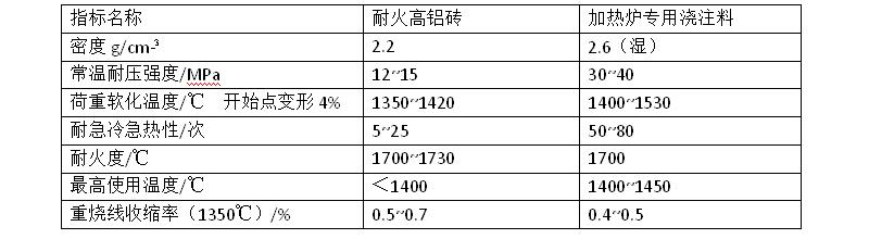 (1)加熱爐專用澆注料有良好的高溫使用性能,加熱爐專用澆注料大幅度提高爐子壽命的原因是這種澆注料的基質石英型AIPO4(熔點約2000℃)呈鏈狀空間網狀高分子結構,所以它除了有良好的耐火性之外,高溫下還具有韌性、抗沖擊性和耐磨性一級熱穩(wěn)定性。當爐溫超過1400℃后,由于燒結等物理化學反應,強度又提高了。因而加熱爐專用澆注料在1400℃以上的高溫時,性能優(yōu)于耐火磚砌筑。兩種耐火材料的主要性能列于表1