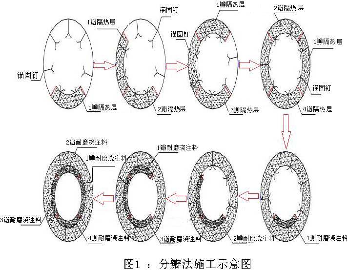 三:管道安裝就位前內襯耐火澆注料施工方法 3.1 分瓣法施工 對于直徑大于φ2500的管道內襯施工程序:錨固釘焊接→1瓣隔熱層施工→2瓣隔熱層施工→管道轉180°→3瓣隔熱層施工→4瓣隔熱層施工→1瓣耐磨層施工→2瓣耐磨層施工→管道轉180°→3瓣耐磨層施工→4瓣耐磨層施工→防變形支撐拆除→支撐位置內襯施工。 每段管道內襯2種材料施工分開4瓣進行施工,每瓣施工完畢停滿12小時后進行下一瓣施工,第一次先澆筑下半區(qū),內襯養(yǎng)生期滿以后,將設備地面翻轉,然后澆筑另一瓣,如圖1所示。