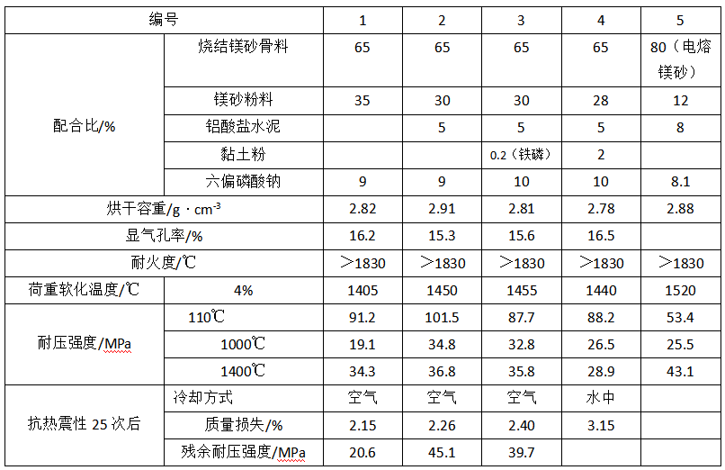 鎂質耐火澆注料通常采用燒結和電熔鎂砂作耐火骨料和粉料,其顆粒級配為5~2.5mm,33%;2.5~1.2mm;1.2~0.6mm,25%;0.6~0.15mm;鎂砂粉細度為<0.09mm的大于85%;采用濃度為30%或當量濃度為4N的六偏磷酸鈉溶液作結合劑,促凝劑用鋁酸鹽水泥;有的摻加燒結機,如鐵磷或黏土粉等。配制工藝是先將耐火骨料與三分之二用量的六偏磷酸鈉溶液拌和,待骨料表面全部濕潤后,再摻加耐火粉料,攪拌均勻,最后加剩余的六偏磷酸鈉溶液,繼續攪拌1-2min;振動成型后,自然養護3d,不得淋水。環境溫度不得低于10℃,越高越好。養護到期,作各種性能檢測。表1-1為鎂質耐火澆注料的配合比和性能。